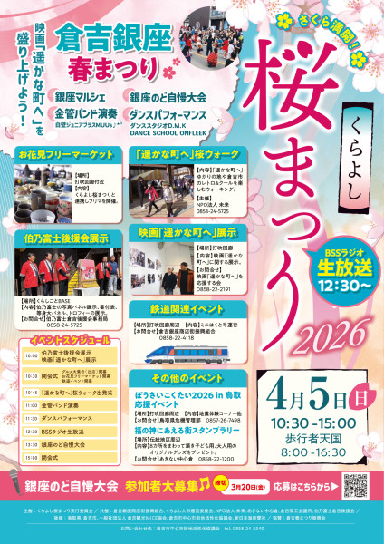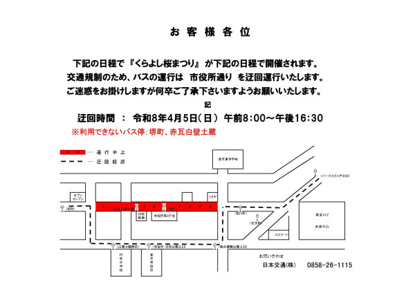 お知らせ トップ お知らせ一覧 【倉吉地区】くらよし桜まつり2026開催による迂回運行について(2026年4月5日) 路線バスのお知らせ 【倉吉地区】くらよし桜まつり2026開催による迂回運行について(2026年4月5日) 2026年3月17日(火) くらよし桜まつり2026迂回地図詳細(PDF) PDFファイルくらよし桜まつり2026公式ページhttps://www.kurayoshi-kankou.jp/topics/ksakuramatsuri2026/ <<戻る 鳥取地区 倉吉地区 米子地区 ご利用案内 乗り放題手形 シルバー定期・お得切符等のご案内 ご利用案内 車両のご案内 お問い合わせ 鳥取東部でタクシーを呼ぶ 鳥取中部でタクシーを呼ぶ 鳥取西部でタクシーを呼ぶ 車両のご案内 観光タクシーのご案内 事業案内 会社案内 営業所案内 採用情報 会社案内 沿 革 企業活動 日交グループ企業 プライバシーポリシー サイトマップ お問い合せ